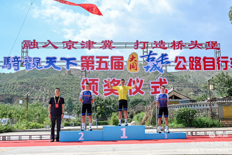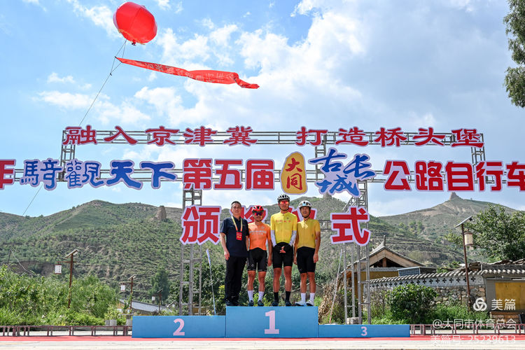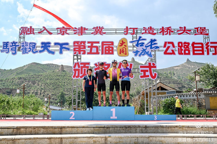 山西省体育局全民健身处处长李晓峰为获得大师组第一赛段前三名选手颁奖,并为冠军颁发黄色领骑衫。