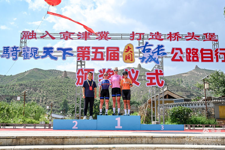大同市体育局副局长晋子顺为获得女子公开组第一赛段前三名选手颁奖,并为冠军颁发黄色领骑衫。