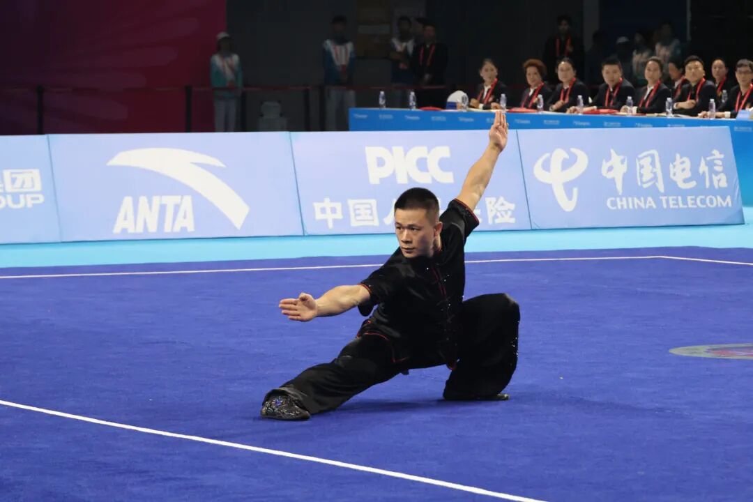 男子长拳是本次比赛首个开赛项目,全国15名运动员依次上场比拼,正踢腿勾手架掌、搂膝弓步插掌、外摆击响、垫步挑掌、蹬腿架拳推掌、弓步劈拳、马步挑掌冲拳、勾手抓肩压肘、弓步冲拳、马步架打,一招一式尽显深厚底蕴。第11位出场的高晓彬得分9.810分,超越江苏选手吴照华的9.790分,暂居第一。随后出场的另一名江苏选手杨亚霖以9.830分超越高晓彬。